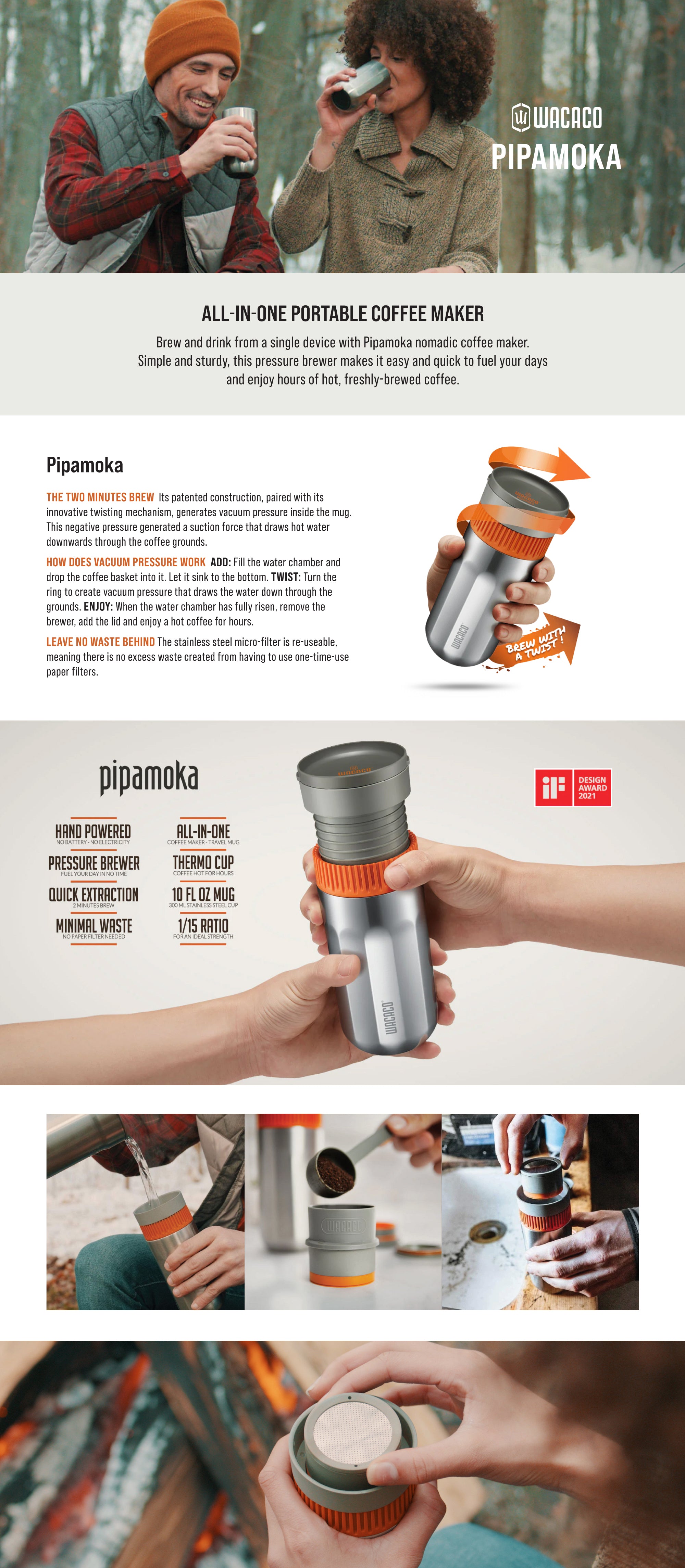 ALL-IN-ONE: Brew and drink from a single device with the Pipamoka all-in-one nomadic coffee maker. Simple, sturdy and brilliant pressure brewer, it becomes super easy and quick to fuel your days and enjoy hours of hot, freshly-brewed coffee during your commutes, work hours or adventures.