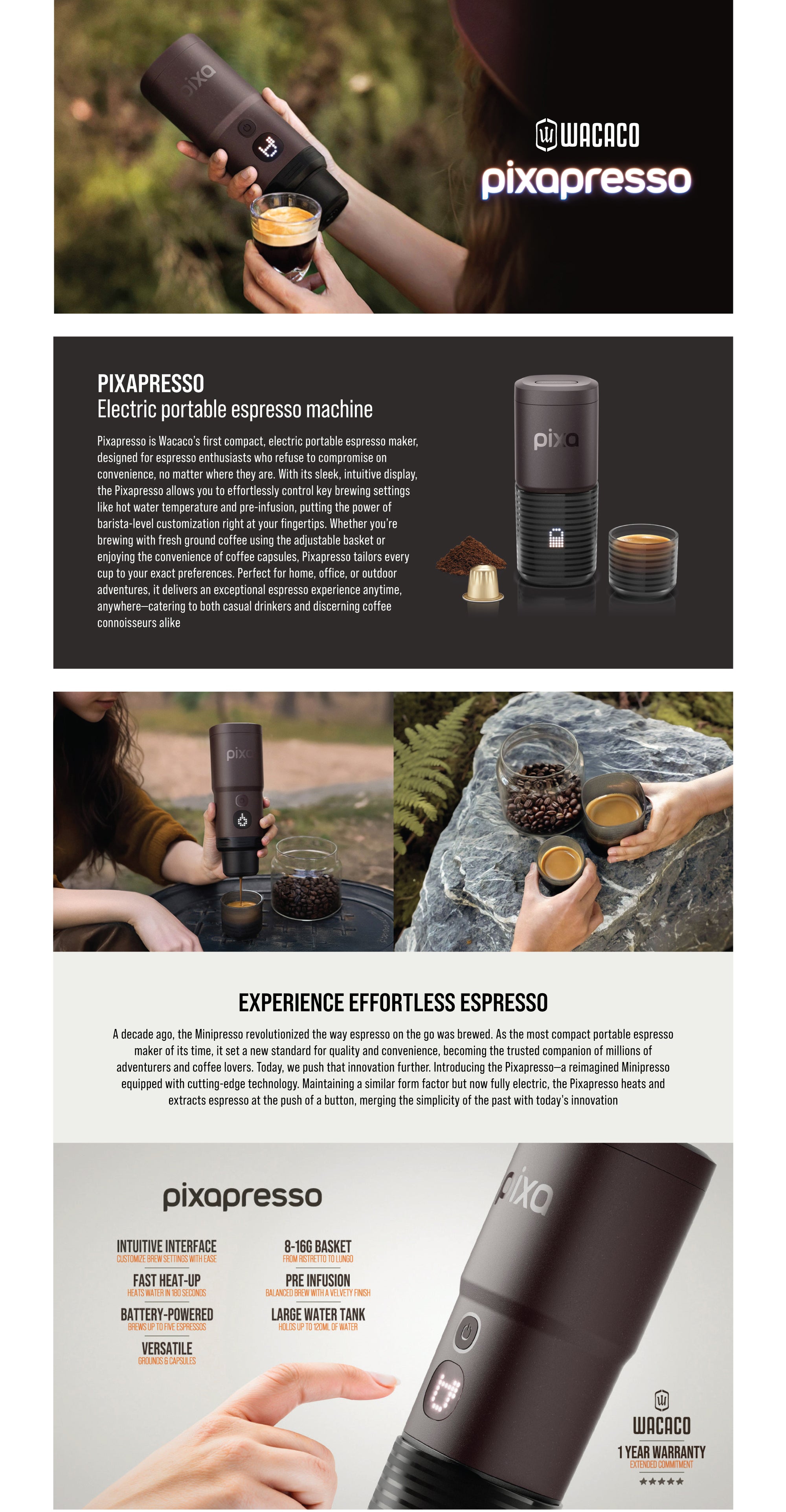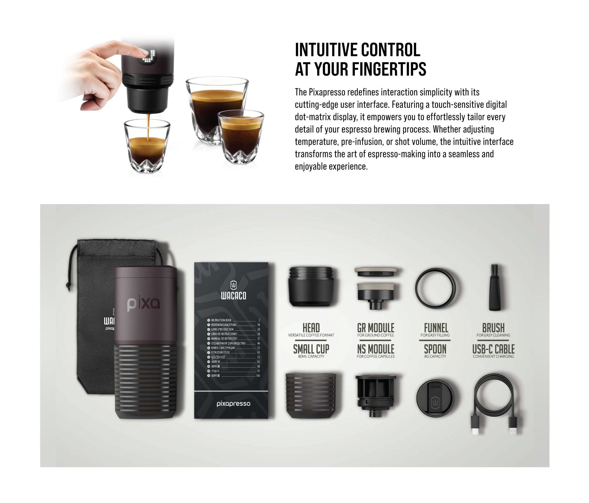 COMPACT AND PORTABLE DESIGN: Designed for on-the-go coffee lovers, the Pixapresso's compact size and lightweight construction make it easy to carry, ensuring you can enjoy quality espresso anywhere, anytime.