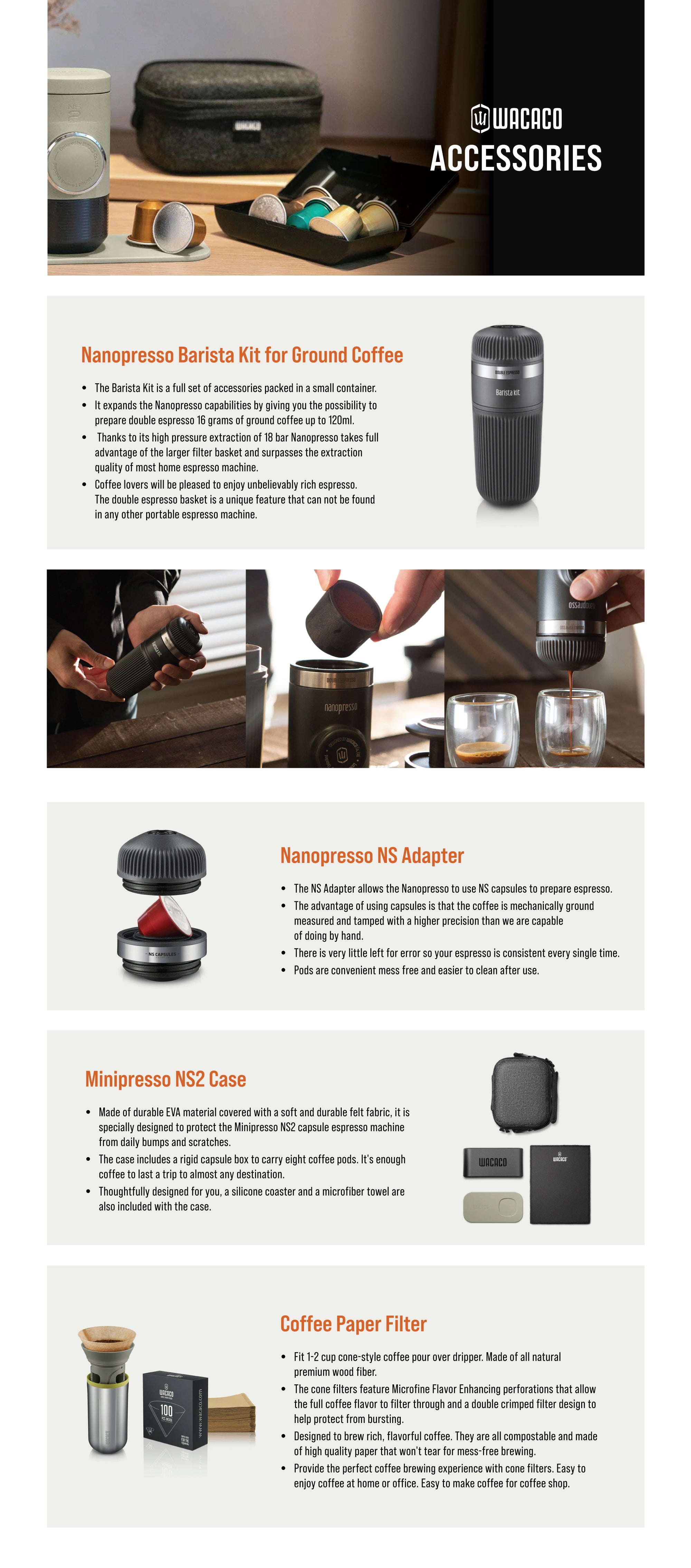 - It expands the Nanopresso capabilities by giving you the possibility to prepare double espresso 16 grams of ground coffee up to 120ml